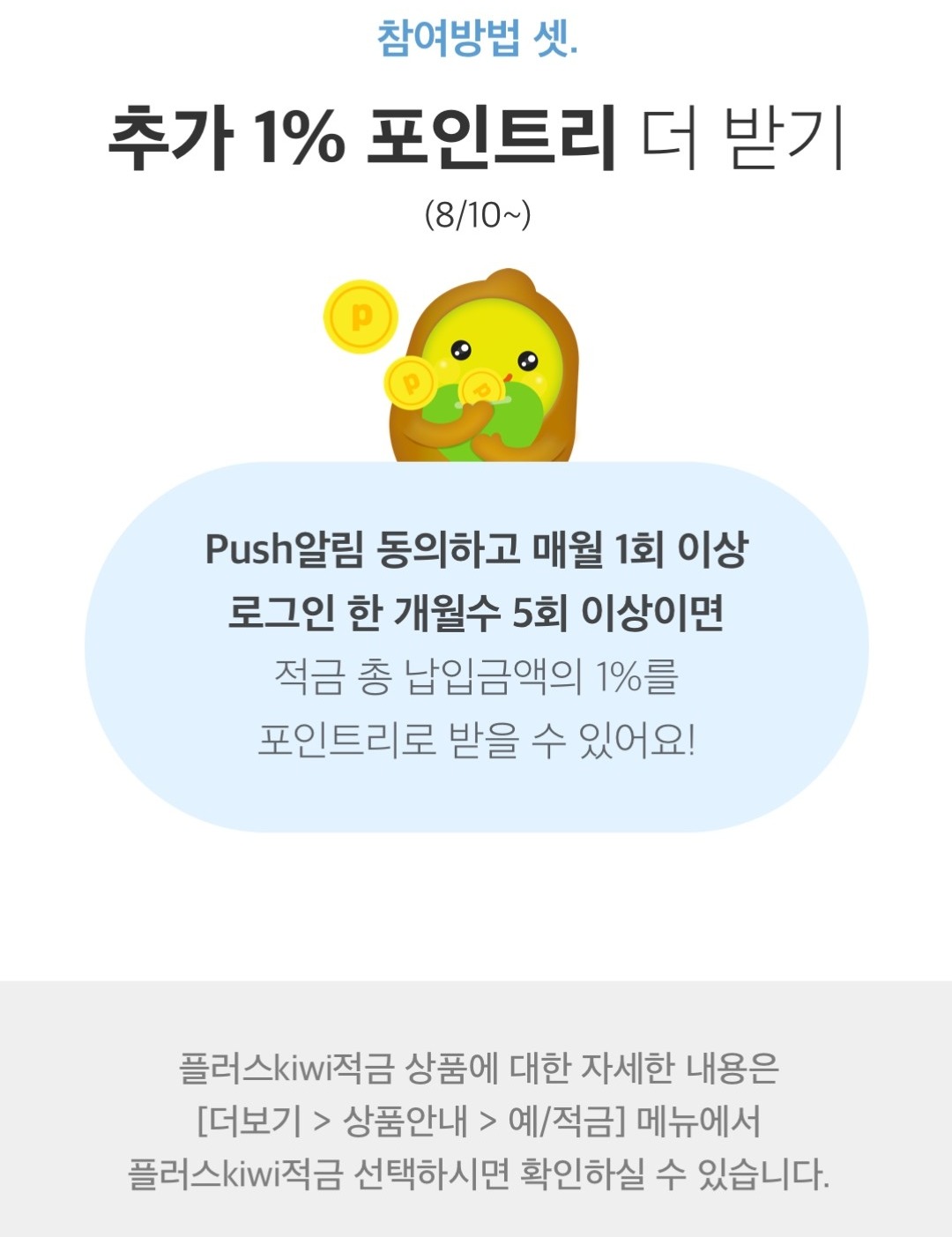 그리고 별도로 추가 1% 포인트리를 더 받으려면 push 알림 동의하고 매월 1회 이상 로그인을 5개월 이상이면 적금 총 납입금액의 1%를 포인트리로 받을 수 있습니다. 여기서 말하는 5개월은 연속 5개월이 아닌 12개월 동안 한 달에 한 번, 총 5번 이상을 로그인하면 되는 겁니다. 미리 가입하고 5달 동안 조건을 채우는 것도 괜찮네요.
