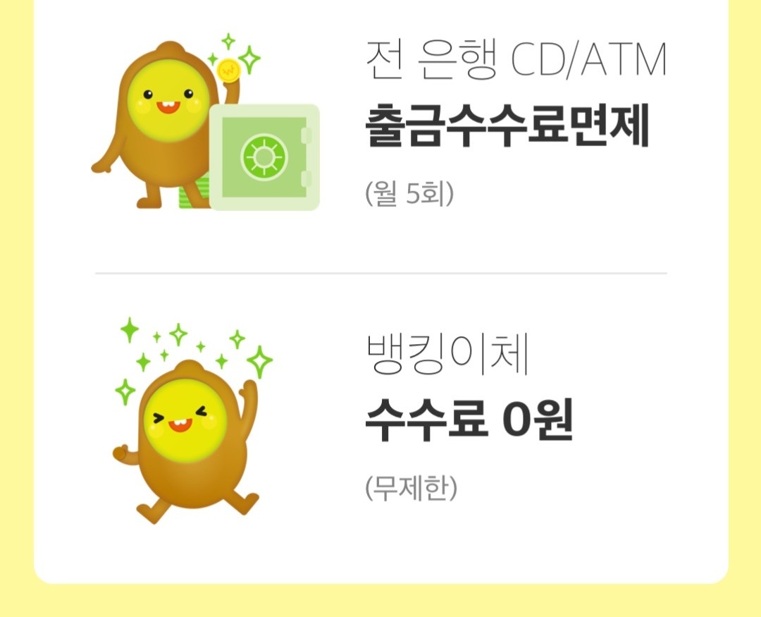 전 은행 CD/ATM 출금수수료 월 5회 면제, 뱅킹 이체 수수료는 0원입니다.