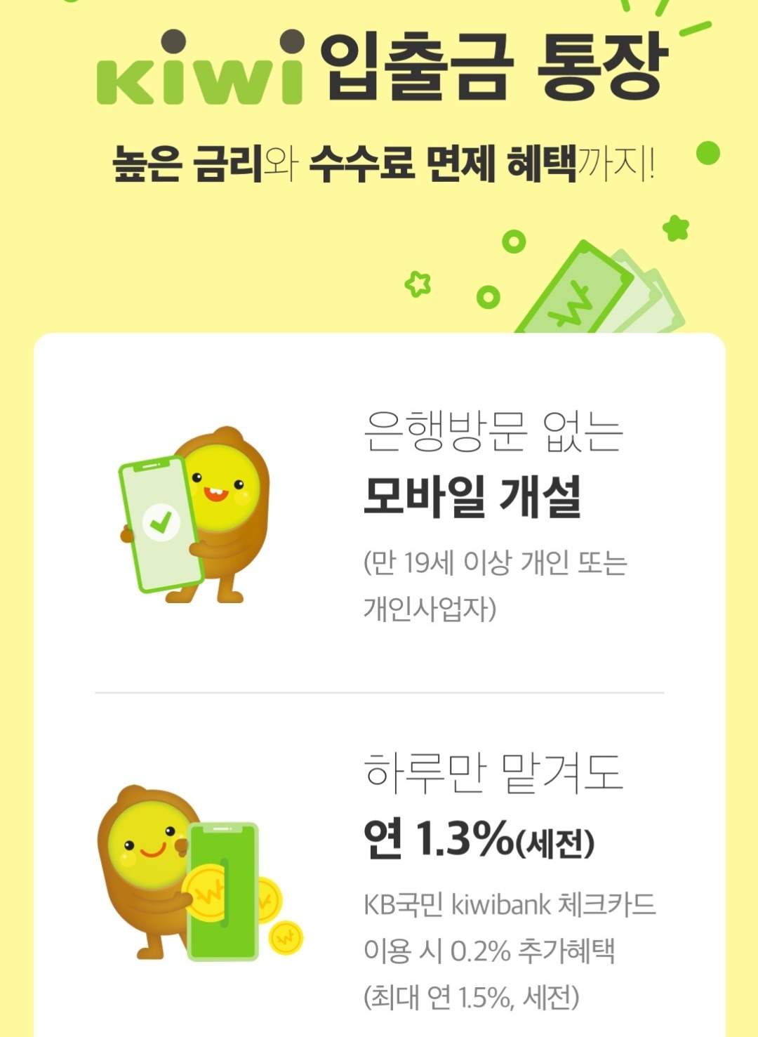 하루만 맡겨도 연 1.3%(세전), KB국민 kiwibank체크카드를 이용하면 0.2% 추가 혜택을 줘서 최대 연 1.5% (세전) 받을 수 있어요. 체크카드 이용하는 조건은 입출금통장 사용설명서 보면 더 자세히 나올 듯합니다.
