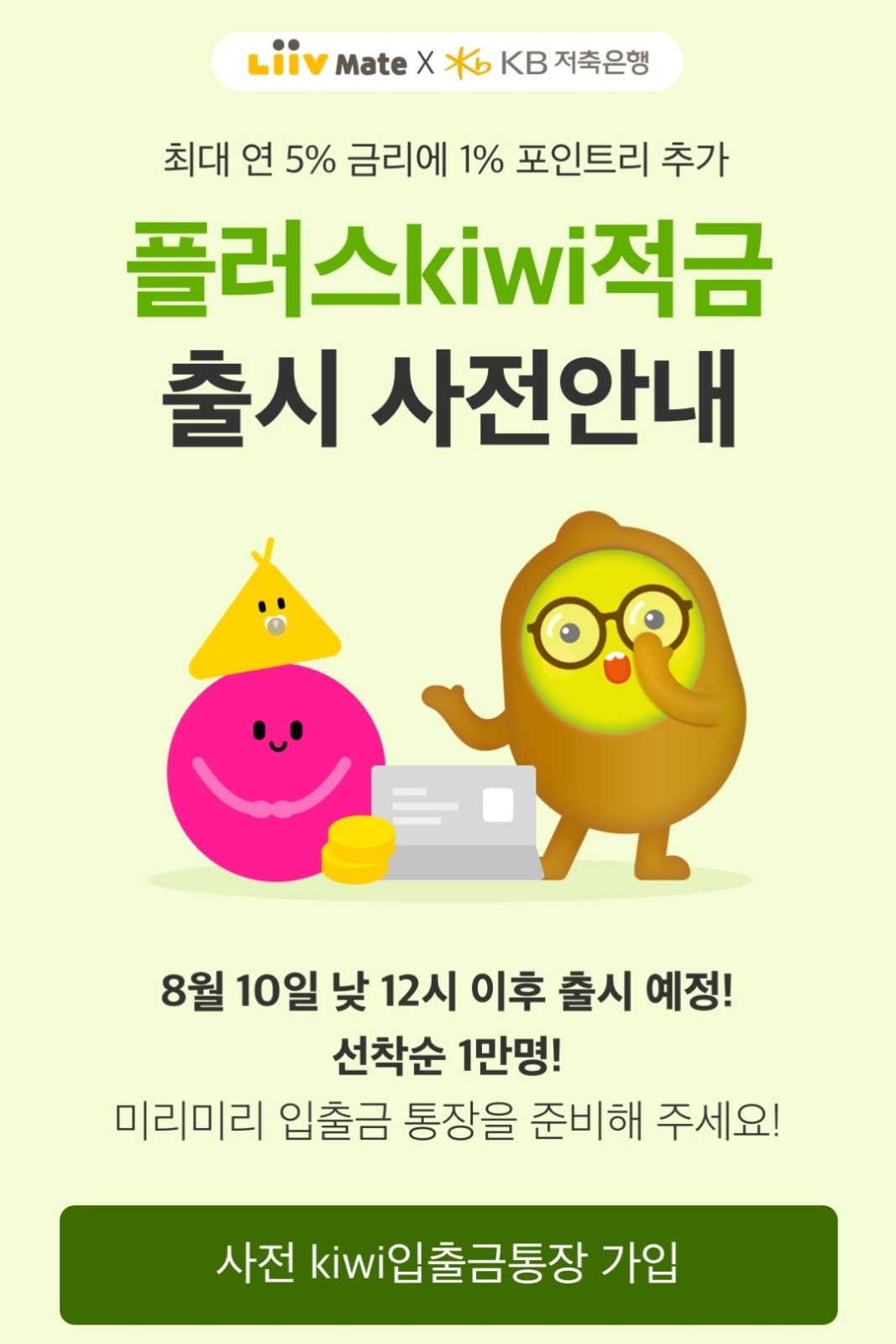 리브메이트와 KB저축은행의 콜라보로 나온 키위 입출금통장, 플러스 키위 적금입니다.