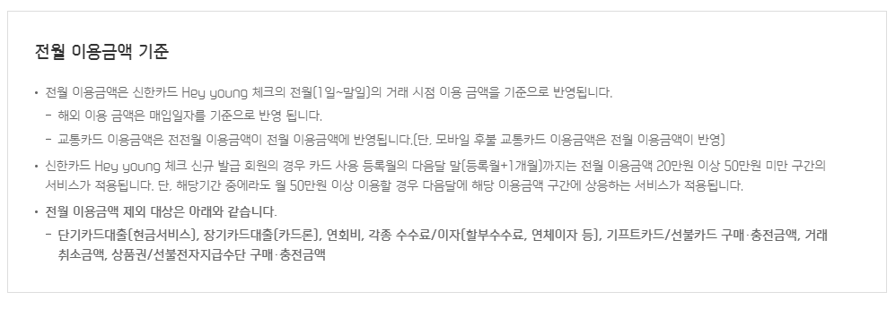신한카드 헤이영 체크카드 캐시백 및 전월 이용금액 기준입니다.