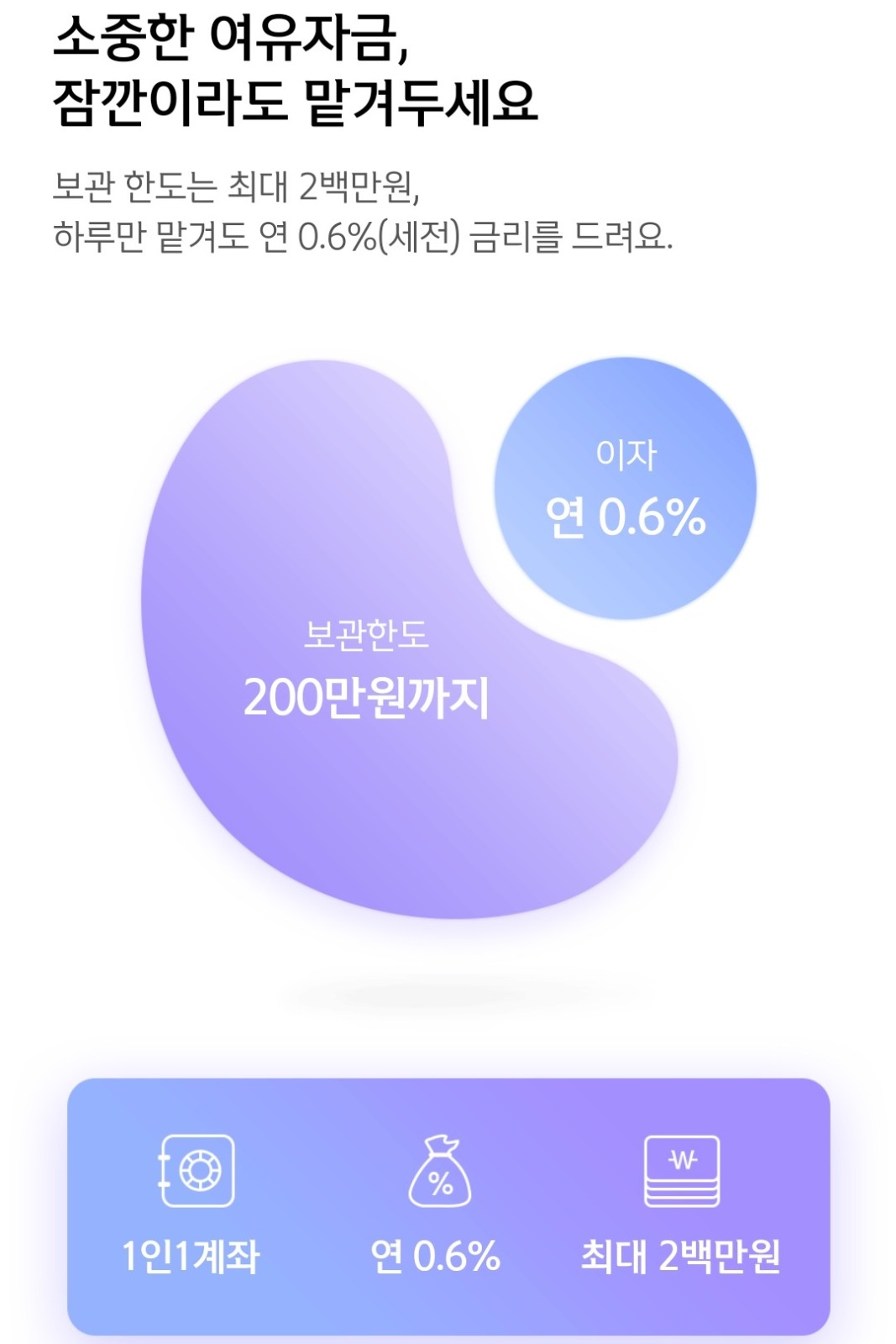 특징 : 파킹통장 (하루만 맡겨도 이자를 제공하는 입출금이 자유로운 상품)