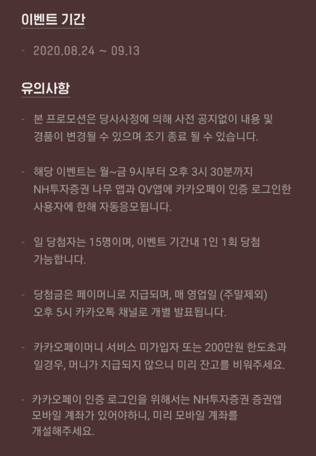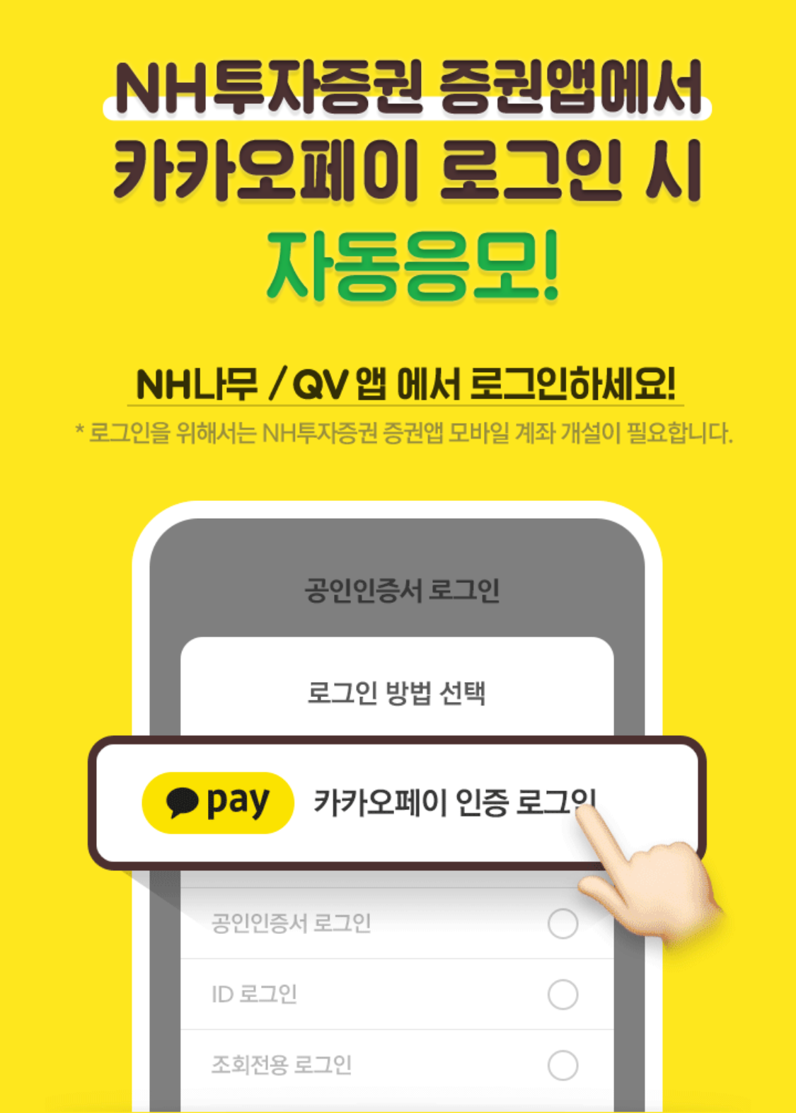 방법 : NH투자증권 증권어플에서 카카오페이 로그인만 하면 자동 응모됩니다. NH나무 / QV앱에서 로그인하세요!