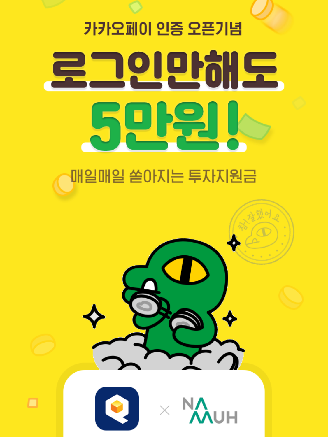 카카오페이 로그인만 해도 5만 원 투자지원금이 지급됩니다.