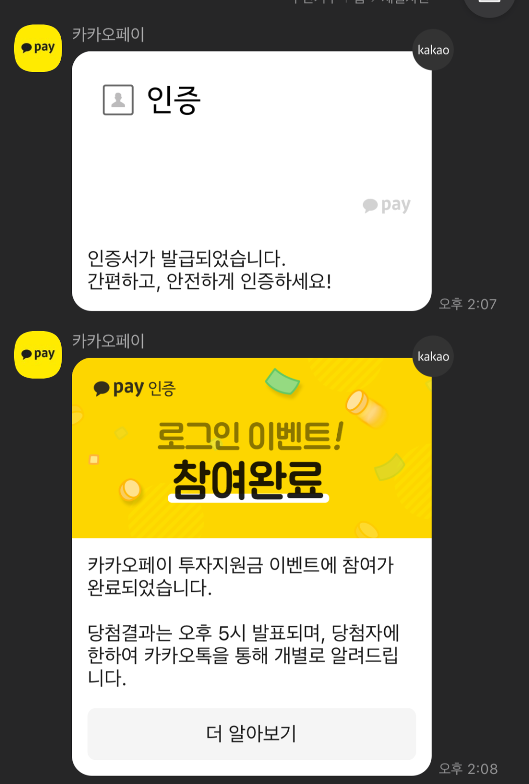 이벤트에 정상적으로 참여했으면 카톡 카카오페이 채널에서 이렇게 팝업창이 뜹니다.