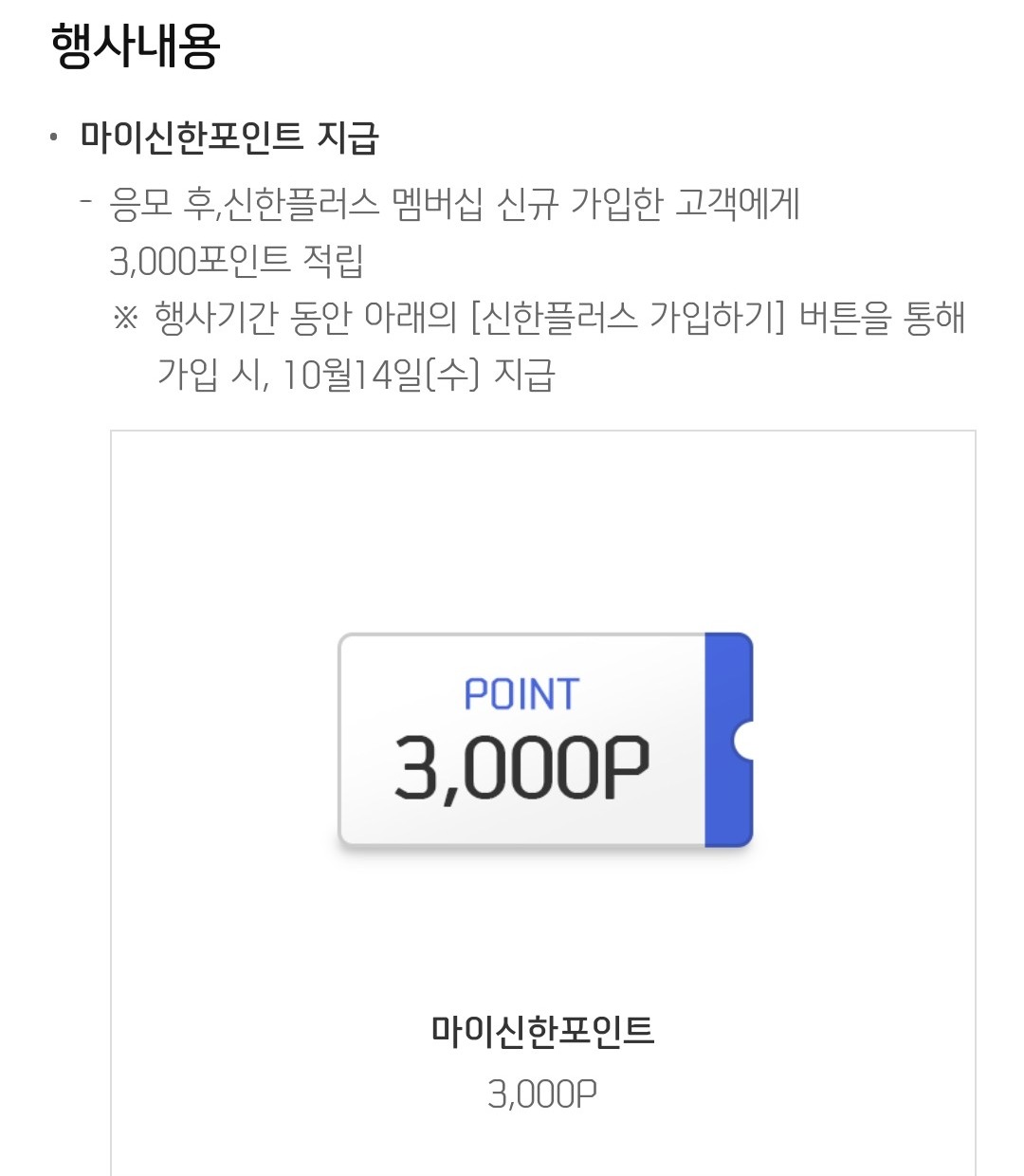 - 응모 후, 신한플러스 멤버십 신규 가입한 고객에게 3,000포인트 지급