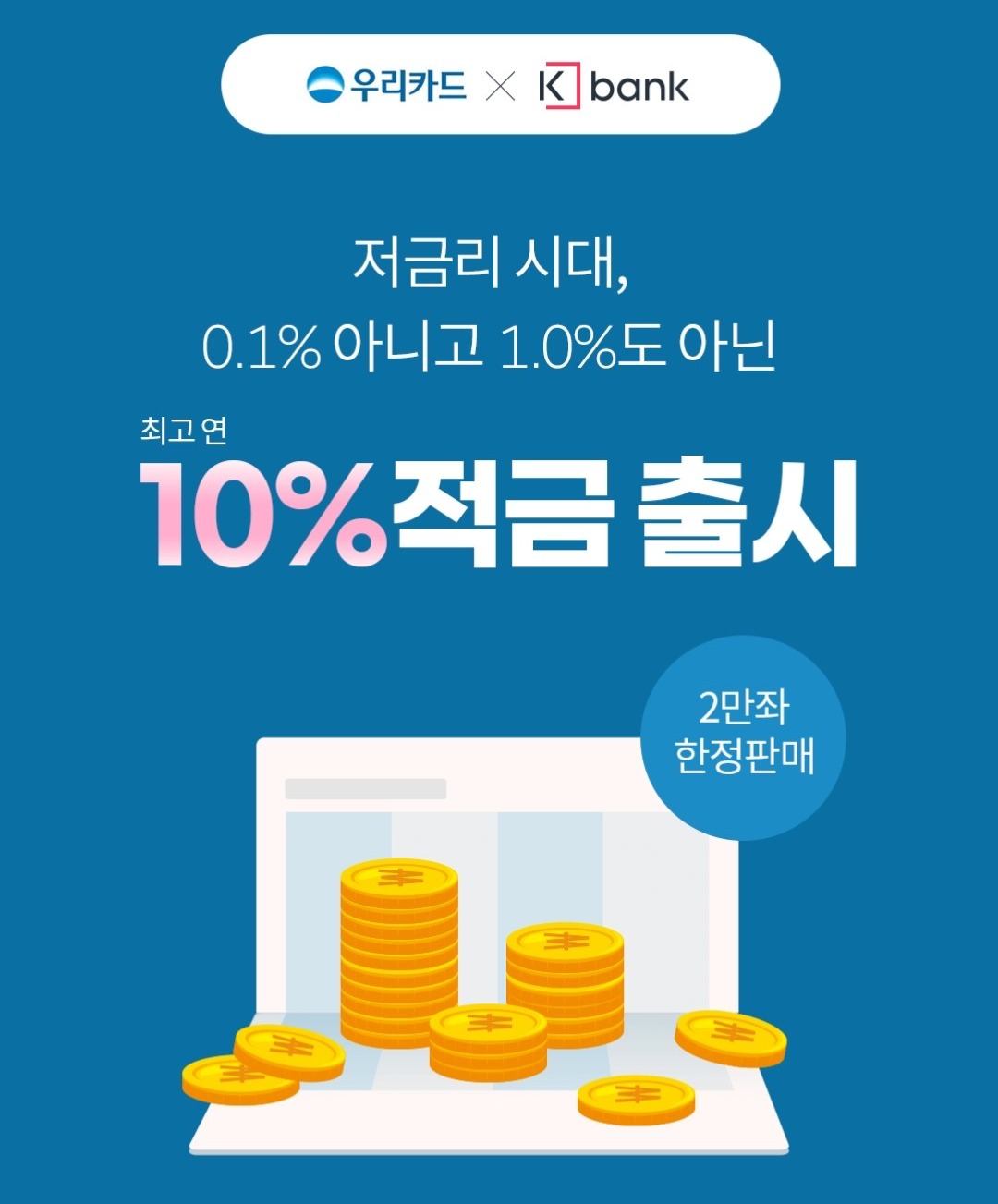 안녕하세요. 오늘 소개할 상품은 우리카드 X 케이뱅크 결합으로 만들어진 최고 연 10% 고금리 적금입니다.