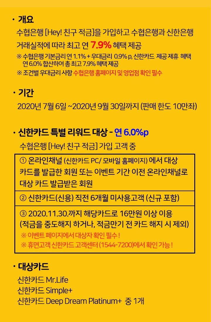 안녕하세요. 이번에 소개할 상품은 수협은행과 신한카드가 만난 <<수협은행 헤이 친구 적금>>입니다.