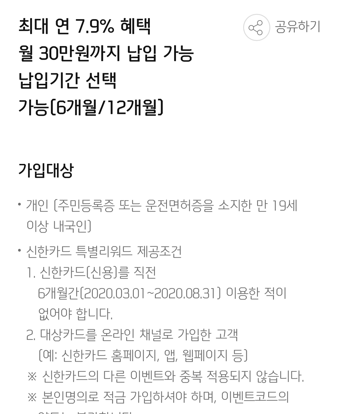 가입하고 싶지만, 저는 올해 메인으로 사용하고 있는 신용카드가 신한이라.. 조건에 충족되지 못합니다 ㅠㅠㅠ