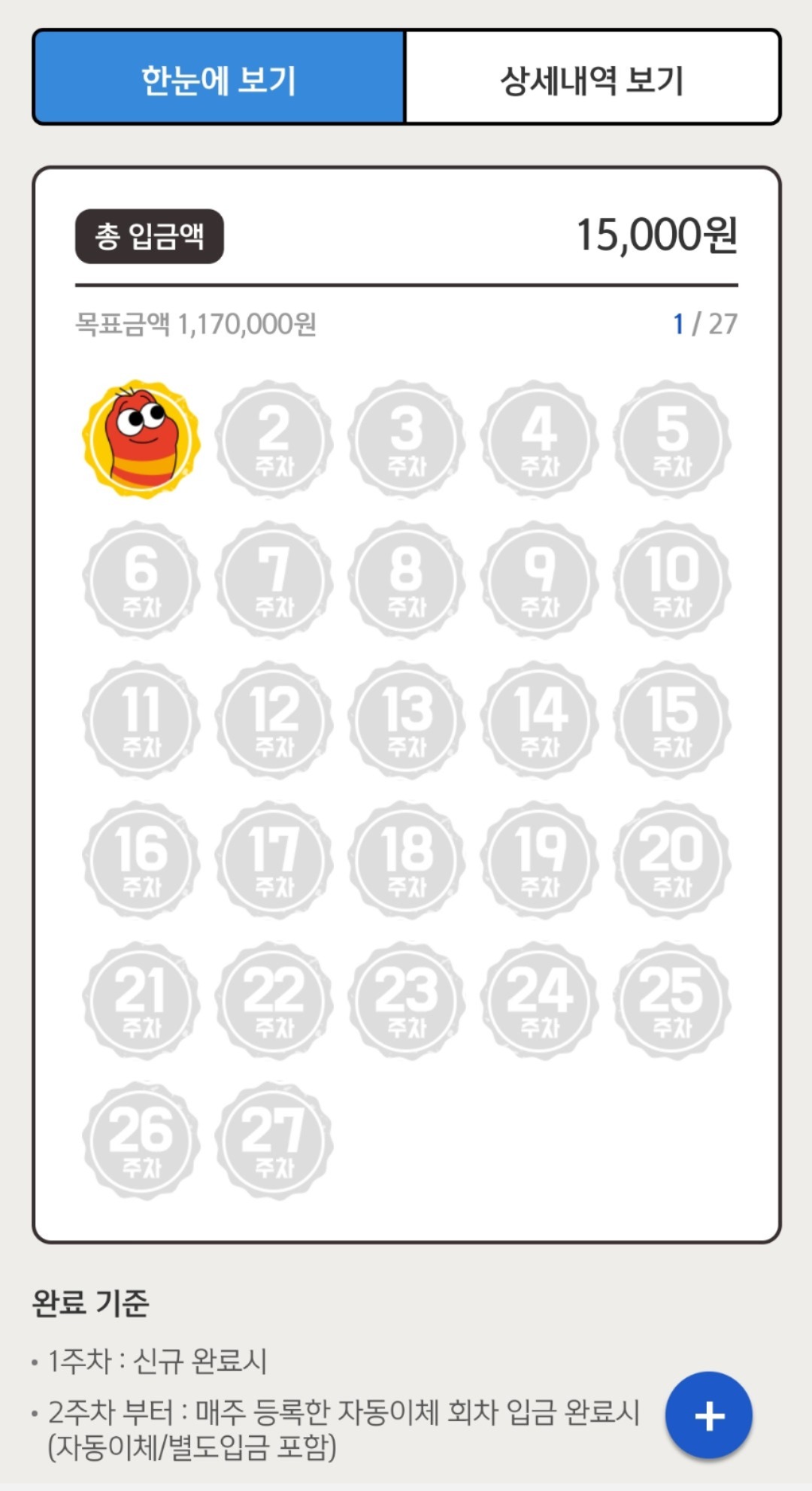 2주 차부터는 매주 등록한 자동이체 회차 입금 완료하면 찍혀요. 이때 자동이체 또는 별도 입금 포함이라고 합니다.