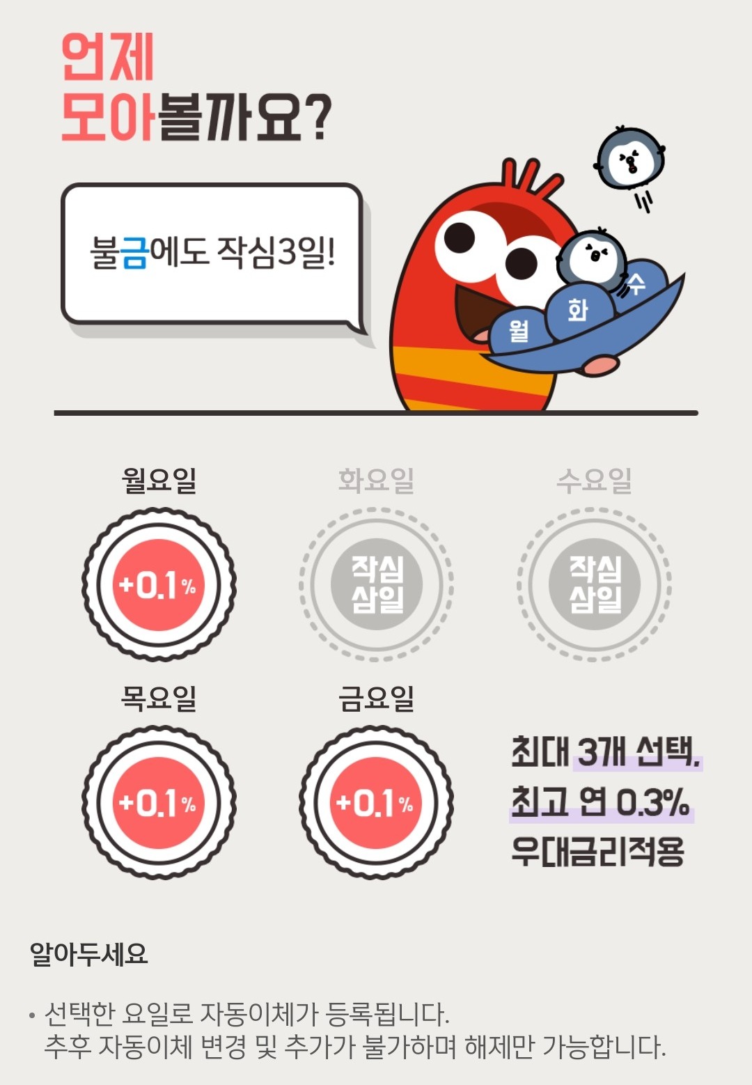 작심 3일 적금이니까, 적금 납입할 요일도 평일 5일 중에 2~3일을 고르면 됩니다.
