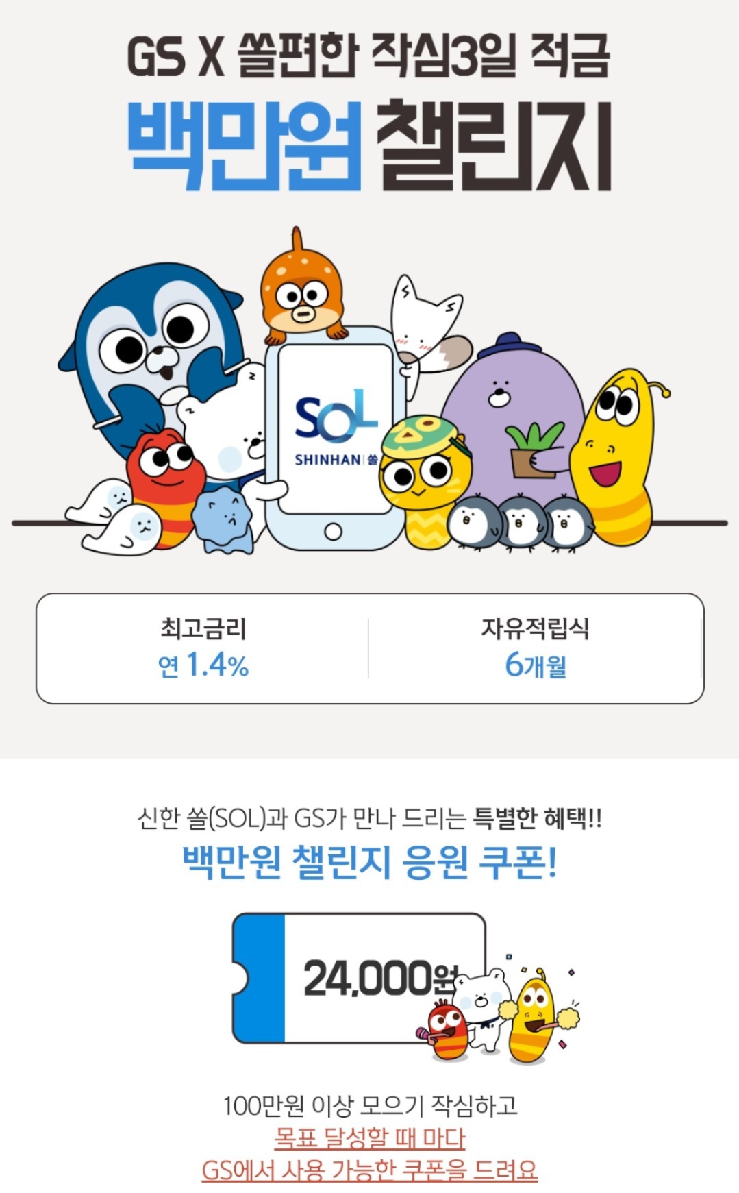 백만 원 모으기 도전하면 최대 GS 상품권 24,000원을 받을 수 있어요.