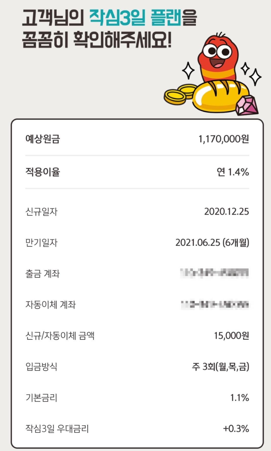 주기적으로 은행에서 적금, 예금 가입 이벤트를 많이 했는데 체리피커처럼 가입하고 상품 받은 날 해지하는 일이 많아졌는지, 이제는 가입하고 저축하는 미션에 성공하면 추가 선물 주는 이벤트가 많이 등장했어요.