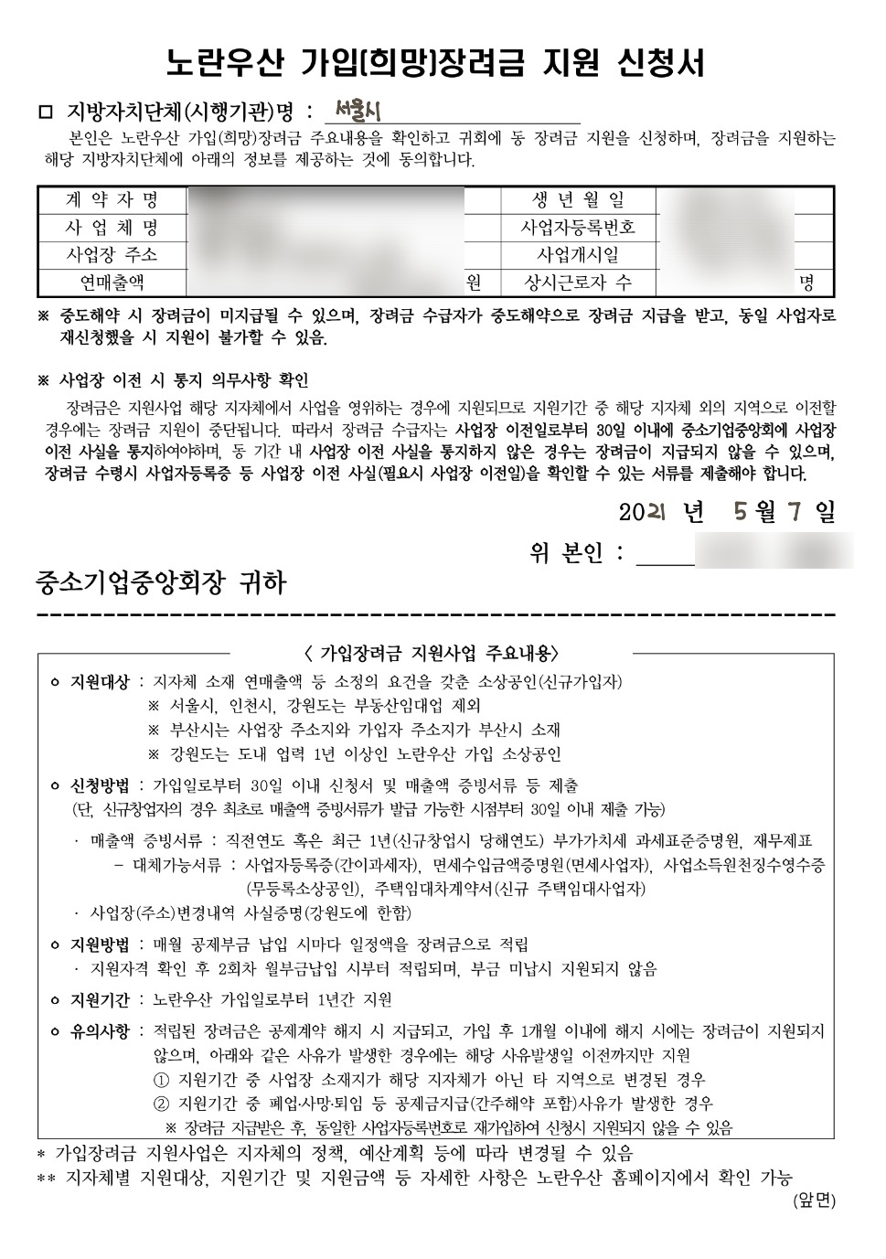 그리고 가입일로부터 30일 이내에 각 지자체 장려금 신청서 및 매출액 증빙서류 제출이 필요해요.