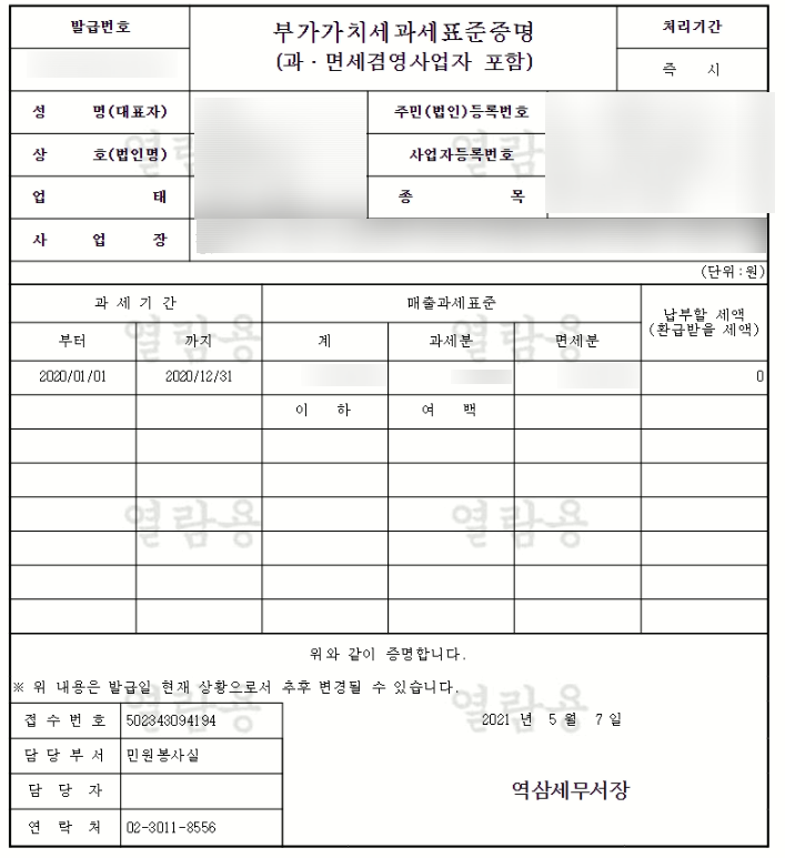 - 매출액 증빙서류 : 직전연도 혹은 최근 1년 부가세 증명원 등 연매출액 증빙서류