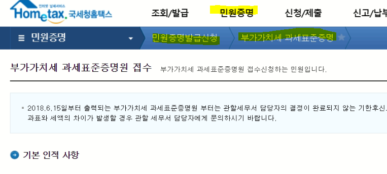 국세청홈택스 > 민원증명 > 민원증명발급신청 > 부가가치세 과세표준증명