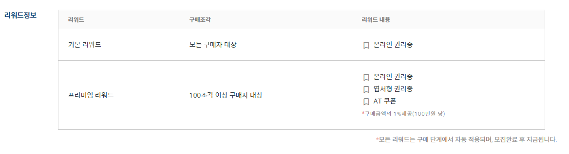 리워드 정보인데요. 100조각 이상 구매하면 프리미엄 리워드도 받을 수 있어요.