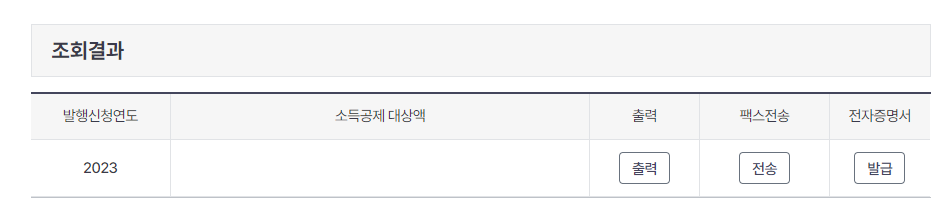 4. 2023년 납부 총액 및 소득공제 대상액이 나옵니다. 출력과 팩스 전송 / 전자증명서이 있는데요.