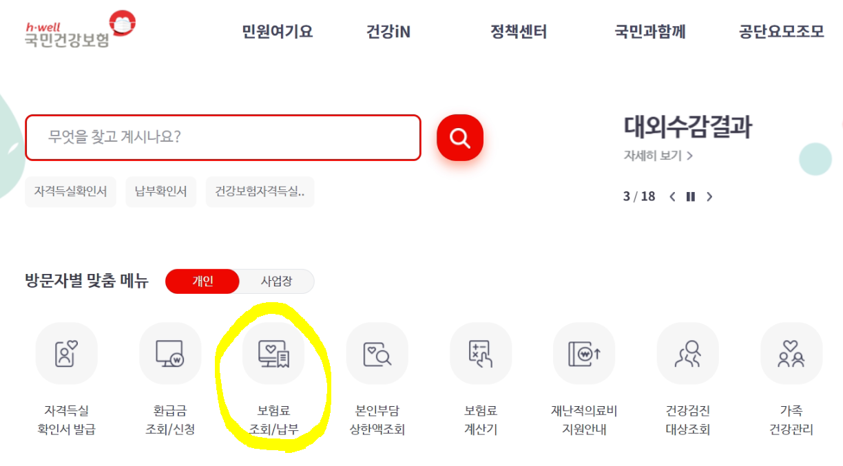 1. 국민건강보험 사이트 로그인 후 <<보험료 조회 / 납부>> 아이콘을 누릅니다.