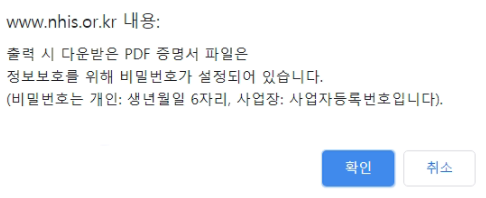 5. 출력 버튼을 누르면 PDF 증명서 파일이 비밀번호 설정되어 있어요. 개인은 생년월일 6자리, 사업자는 사업자등록번호를 입력하면 됩니다.