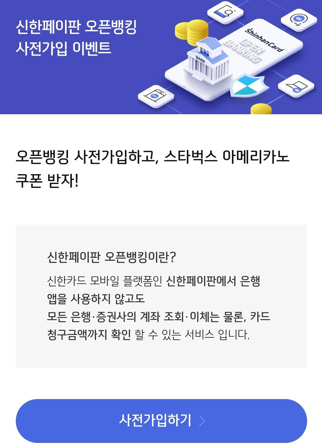 오픈뱅킹 사전가입하고, 스타벅스 아메리카노 쿠폰 받자!