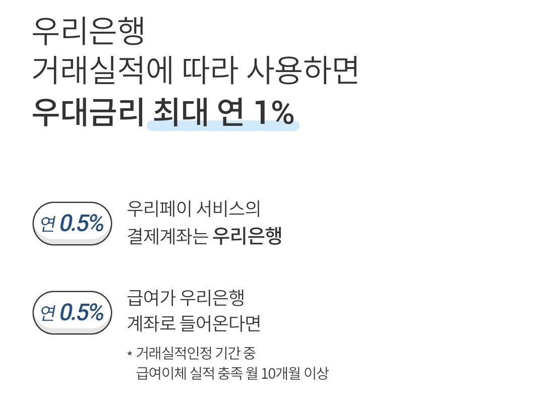 - 급여가 우리은행 계좌로 들어온다면 연 0.5% (10개월 이상)