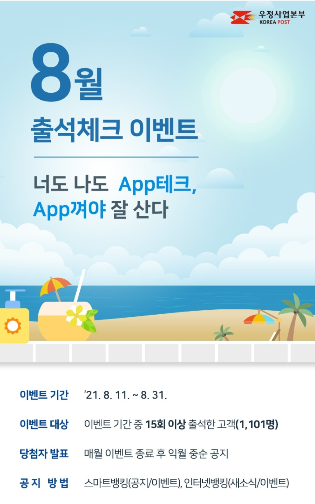 8월 11일부터 8월 31일까지 이벤트 기간 동안 15회 이상 출석한 고객 1,101명에게 선물을 준다고 합니다.
