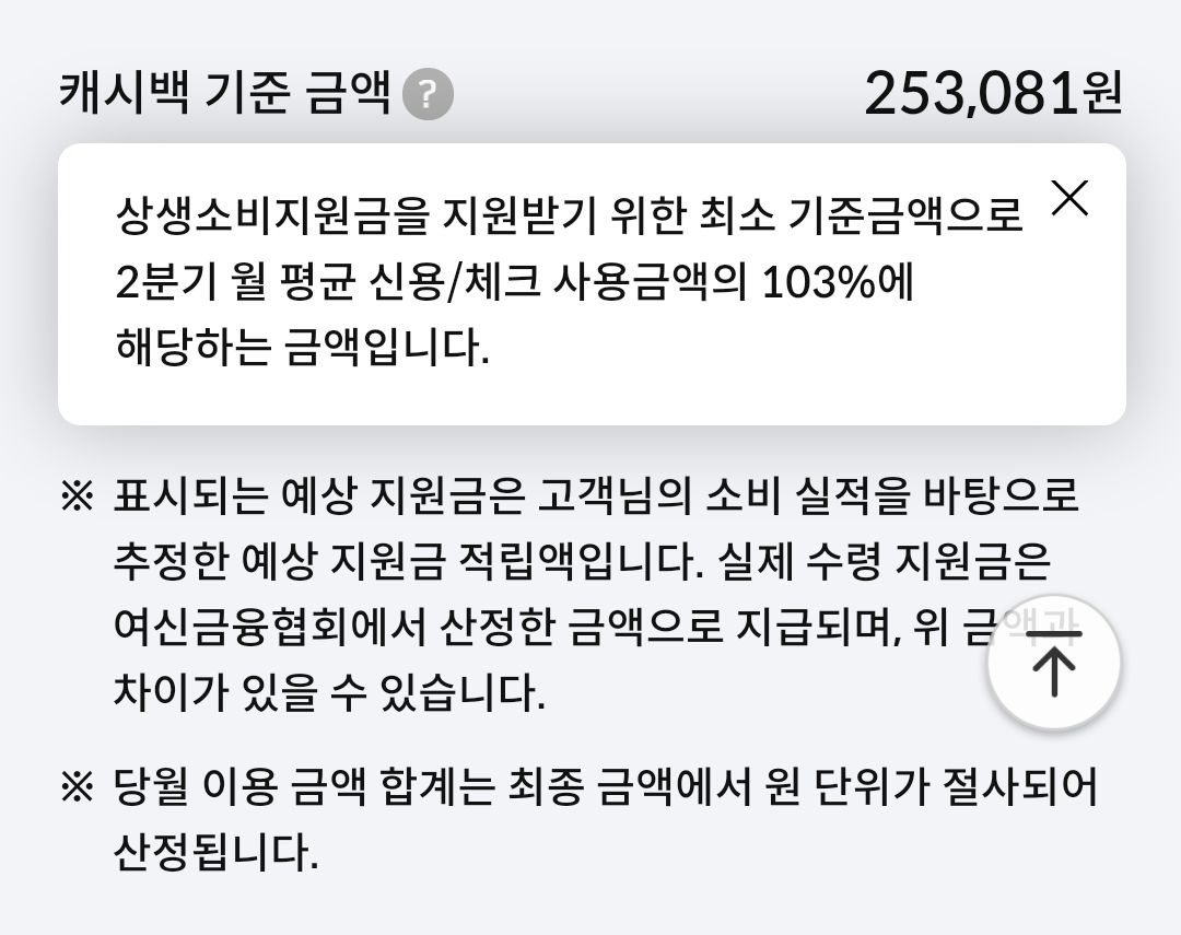 캐시백 기준 금액은 예상 지원금 적립액이라 저처럼 카드회사 여러 개 쓴다면 확정 아닙니답!!!