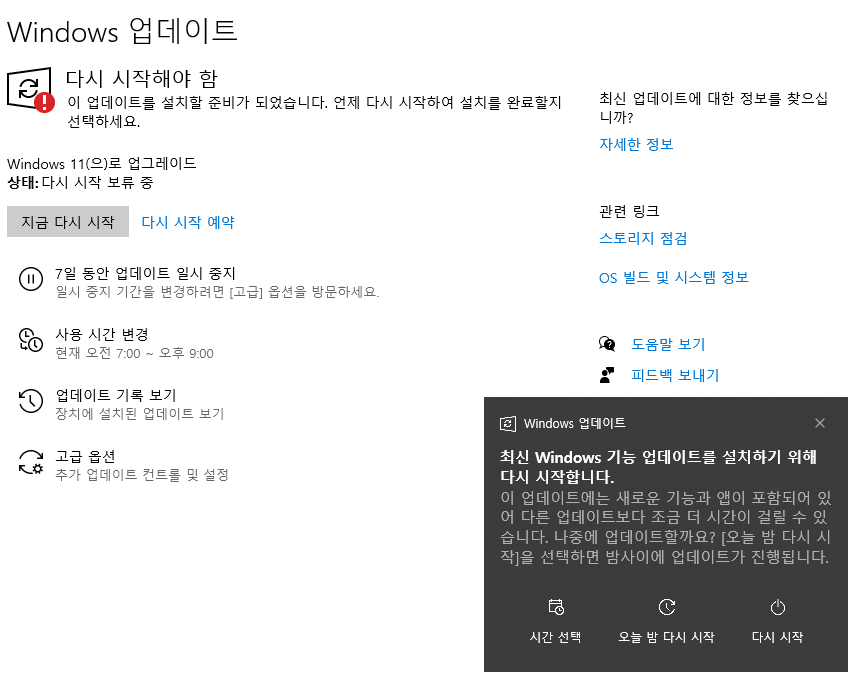 여기서 지금 다시 시작 버튼을 누르면 강제 재부팅됩니다.