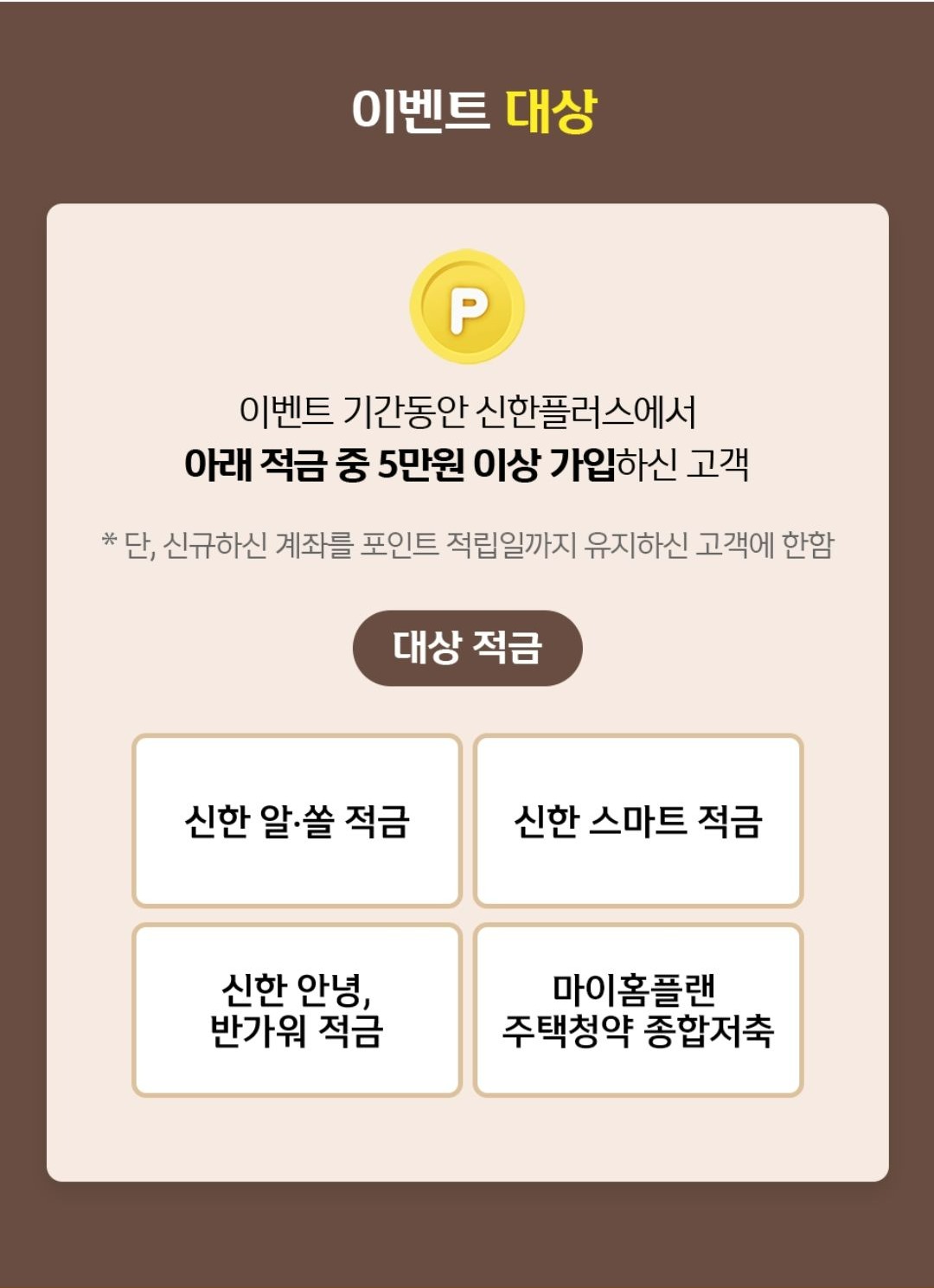 ✔ 이벤트 대상 : 이벤트 기간 동안 신한플러스에서 해당 대상 적금 5만 원 이상 가입한 고객