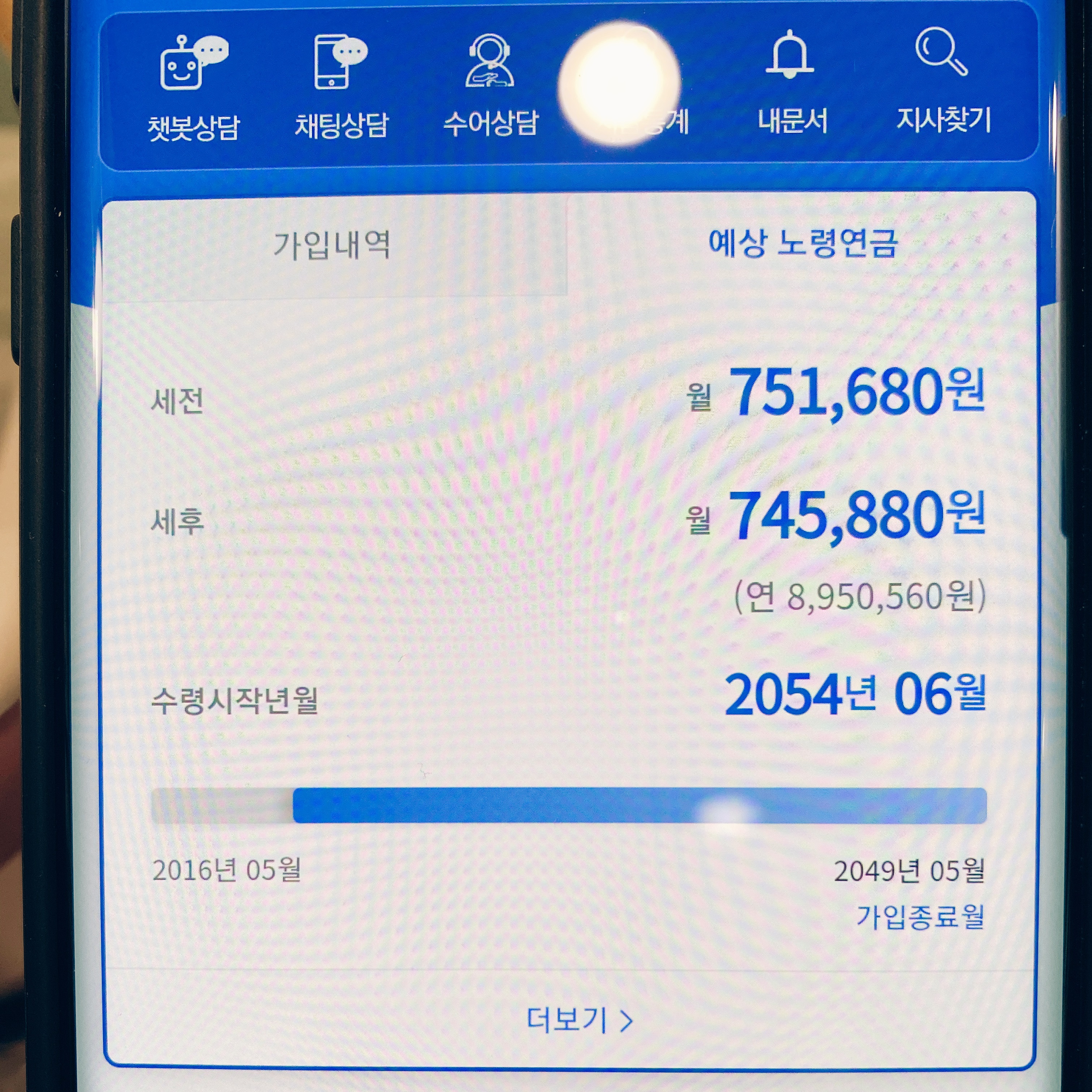 처음 8만 원 정도 납입했을 때 노후에 받는 연금은 월 60만 원 후반 대였는데, 지금은 70만 원 초반...