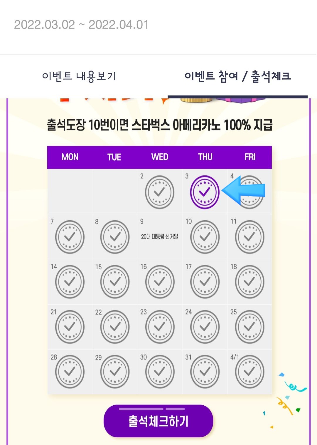 10번만 출석체크하면 스타벅스 아메리카노 기프티콘을 받을 수 있습니다.