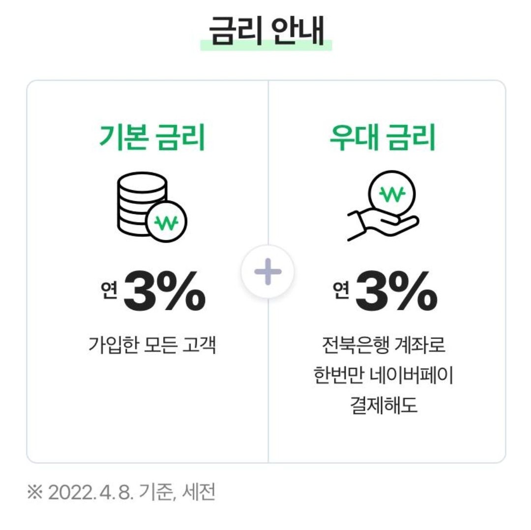 우대금리 : 연 3% (전북은행 계좌로 한 번만 네이버페이 결제)