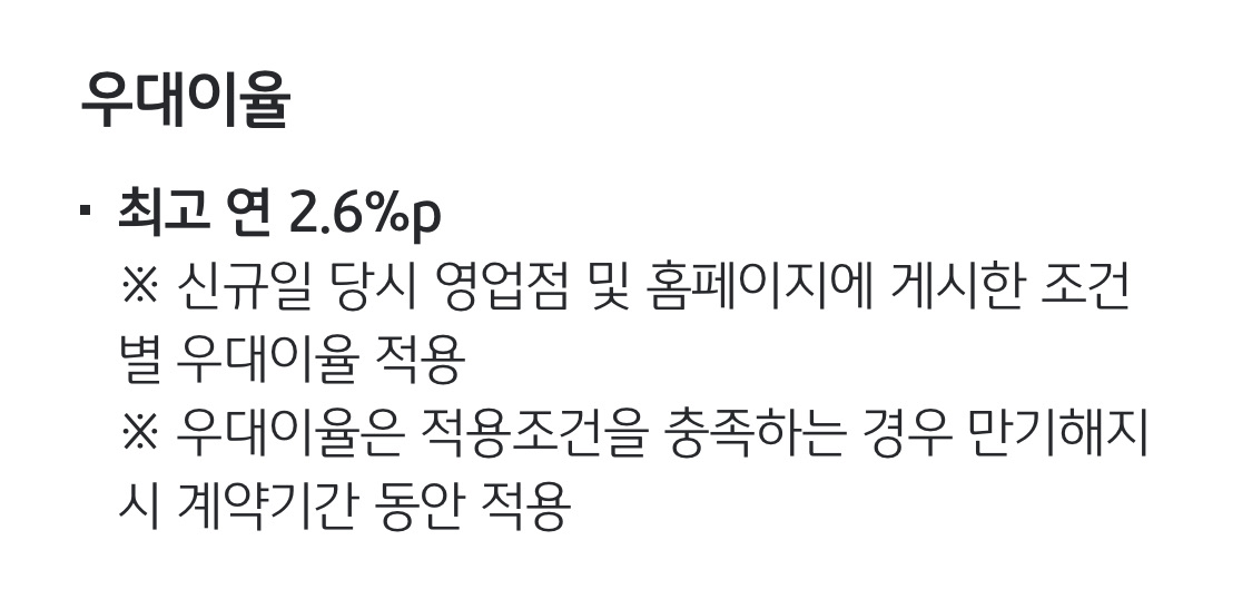 우대이율은 최고 연 2.6%p로 기본이율과 합하면 총 연 4%가 나와요.