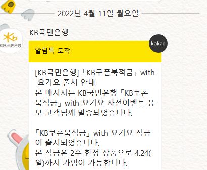 어제 kb국민은행에서 요기요 적금 사전 이벤트 응모한 고객에게 적금 출시되었다는 알람 왔어요.