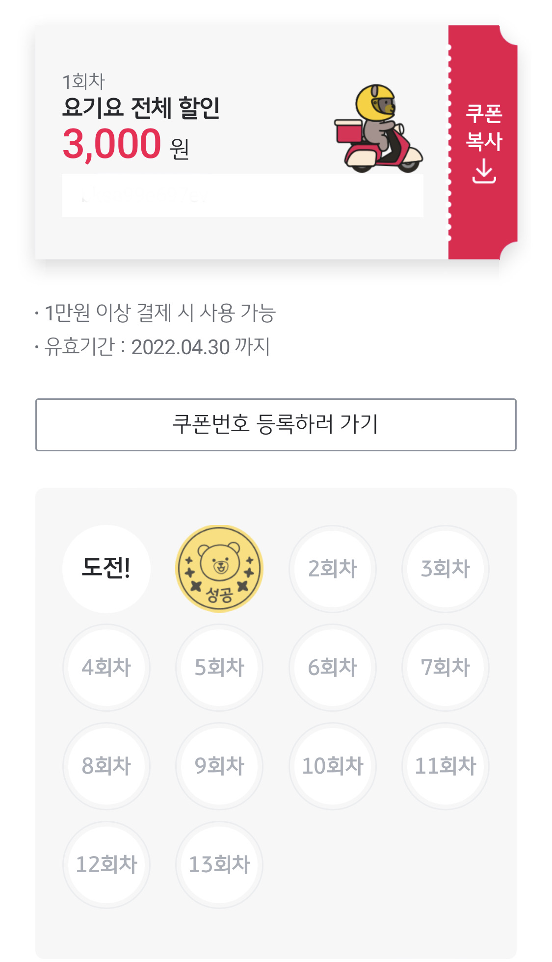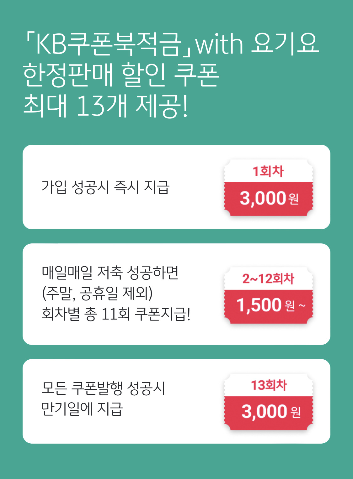 13회 차 때 모든 쿠폰 발행 성공하면 만기일에 3,000원 지급합니다.