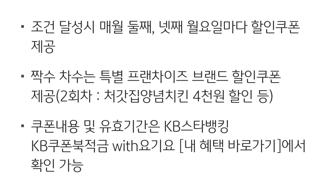 ✔ 조건 달성하면 매월 둘째, 넷째 월요일마다 할인쿠폰 제공 ✔ 짝수 차수는 특별 프랜차이즈 브랜드 할인쿠폰 제공 (2회차 : 처갓집양념치킨 4천 원 할인 등) ✔ 쿠폰 내용 및 유효기간은 KB스타뱅킹 KB쿠폰북적금 with 요기요 [내 혜택 바로가기]에서 확인 가능 |