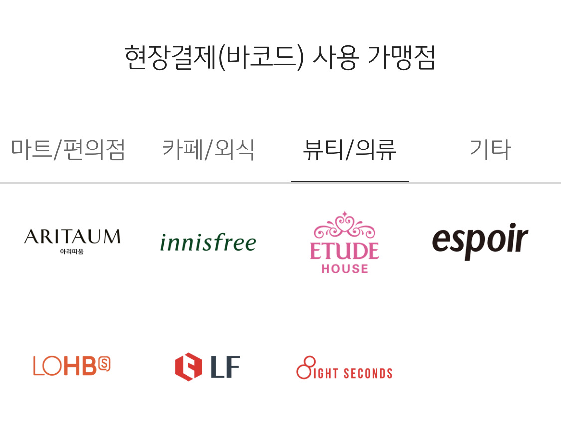- 현장 결제는 NFC 결제 불가하며 오프라인 사용처에서만 결제 가능