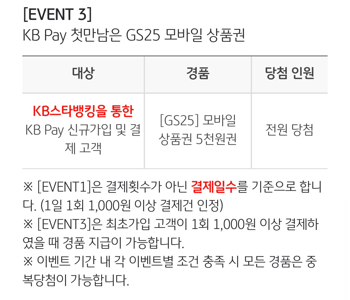 3) KB스타뱅킹을 통한 KB PAY 신규가입 및 결제 고객 : GS25 모바일 상품권 5,000원