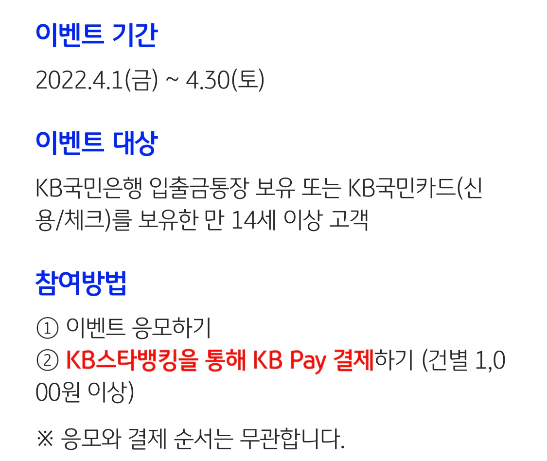 - 모든 이벤트는 KB페이 결제 서비스를 이용할 경우만 조건 달성 인정