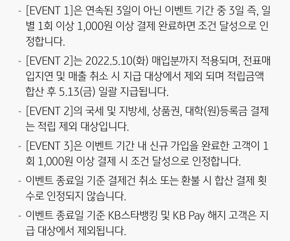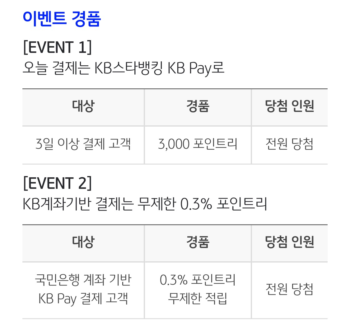 - 이벤트 종료일 기준 KB스타뱅킹 및 KBPAY 해지 고객은 지급 대상 제외