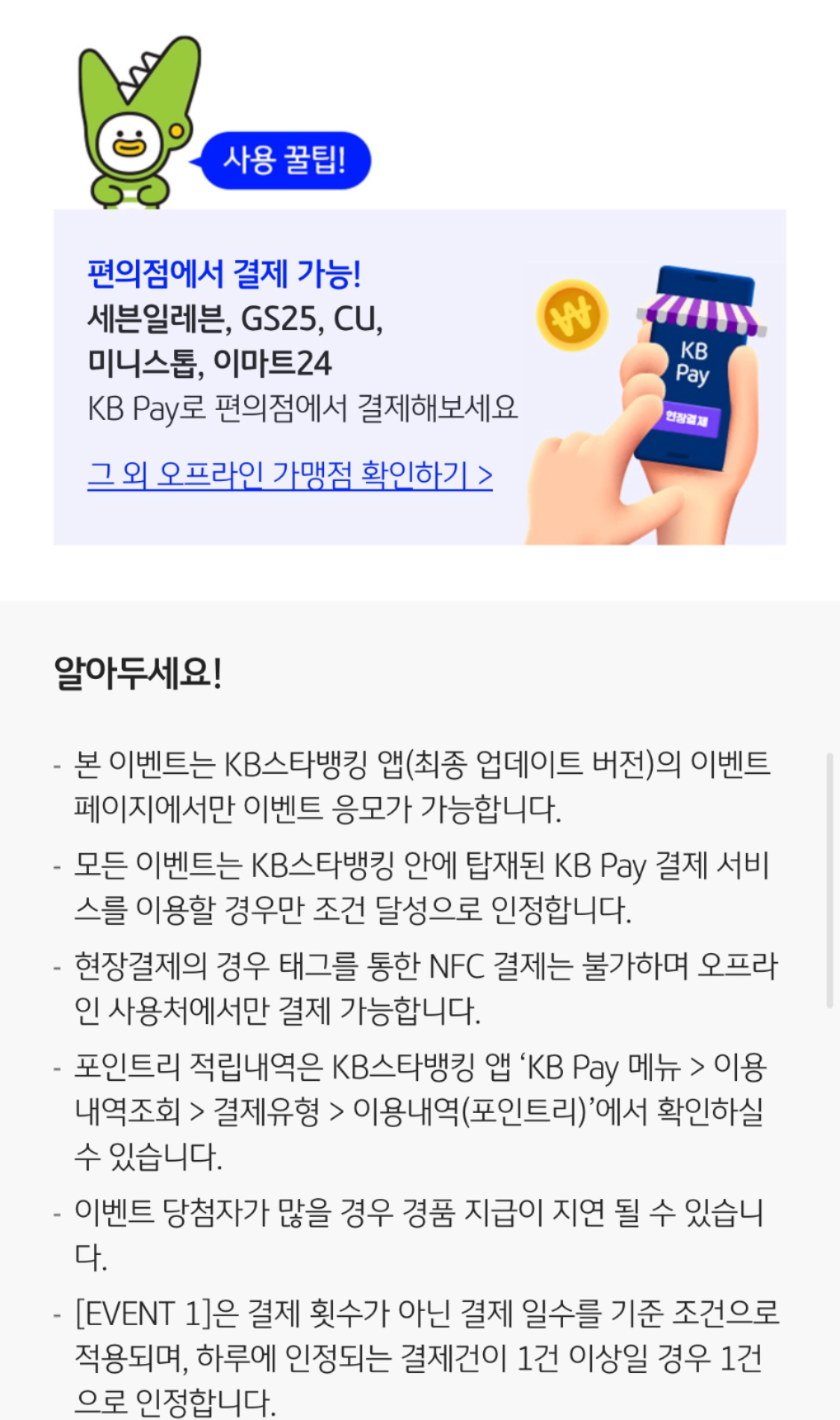더 다양한 이벤트가 있어야 케이비페이를 쓸 텐데..라는 생각도 들었어요.