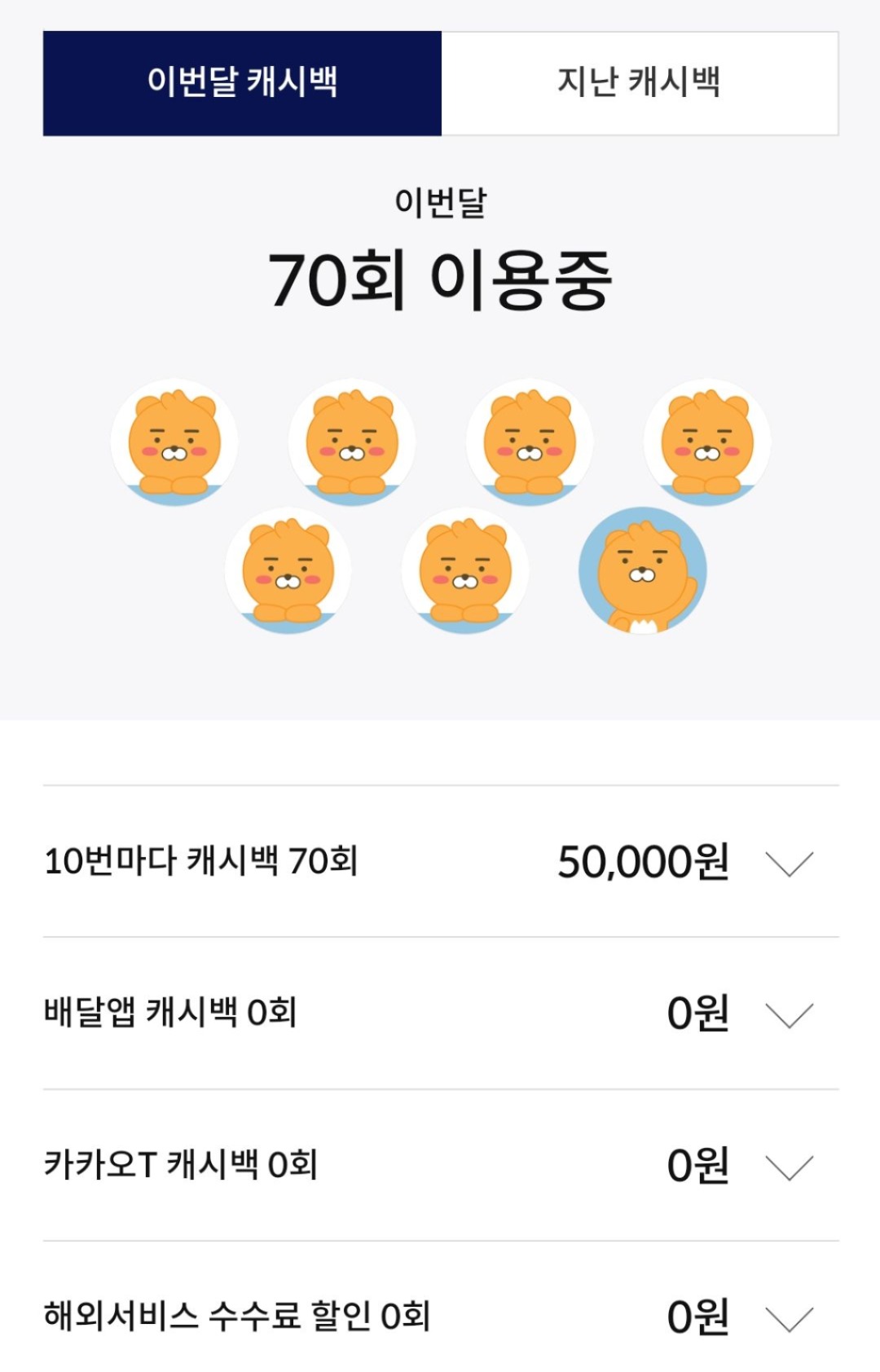 요거 필요 없으면 5,000원씩만 결제하면 횟수마다 캐시백 해주는데, 70회 찍으면 5만 원 환급입니다.
