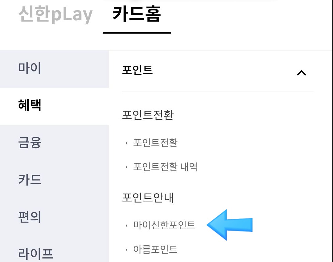 매달 12일쯤 신한플레이 어플 > 카드홈 > 혜택 > 포인트안내 > 마이신한포인트
