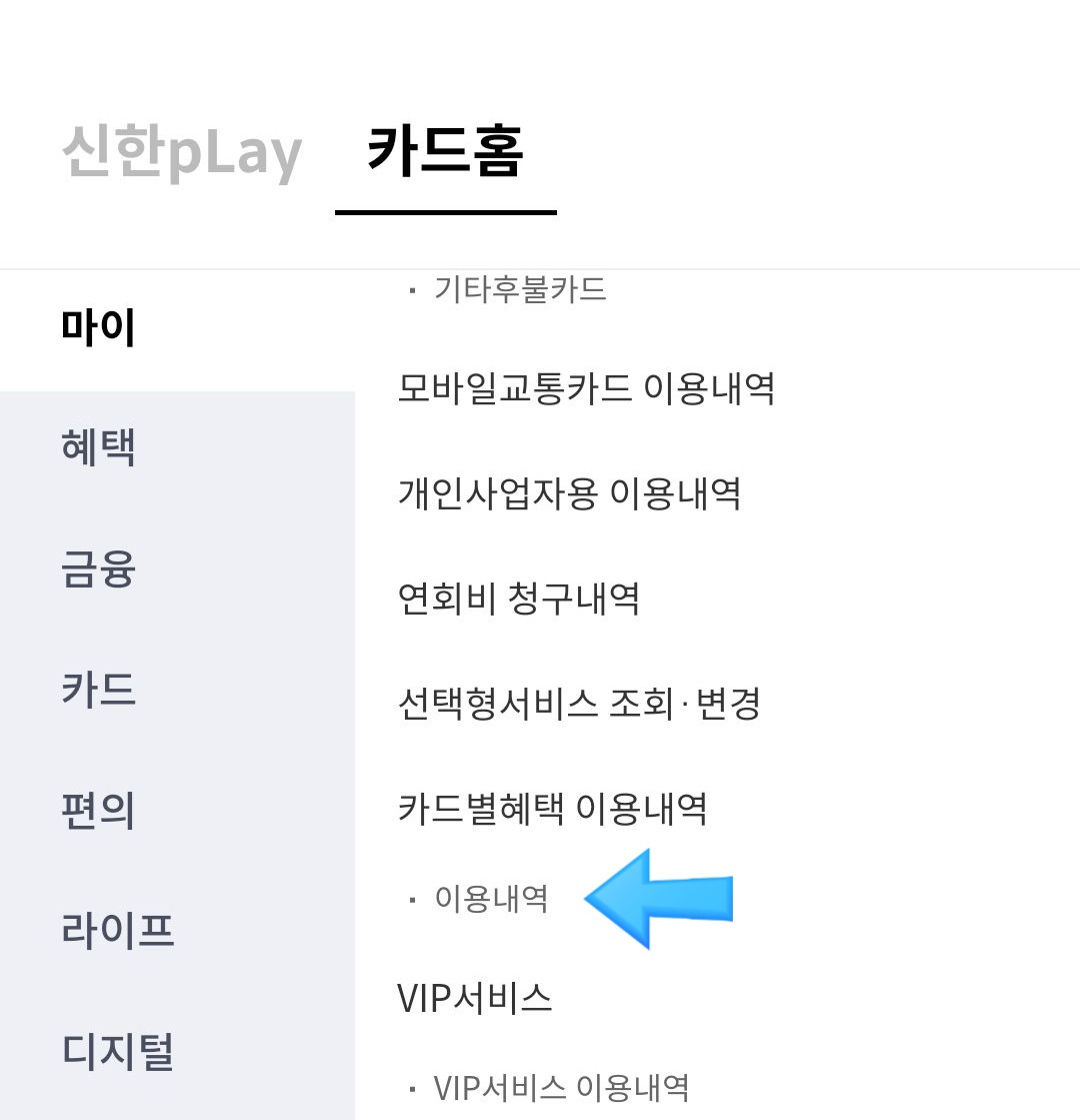 신한플레이 어플 > 카드홈 > 마이 > 카드별혜택 이용내역 > 이용내역