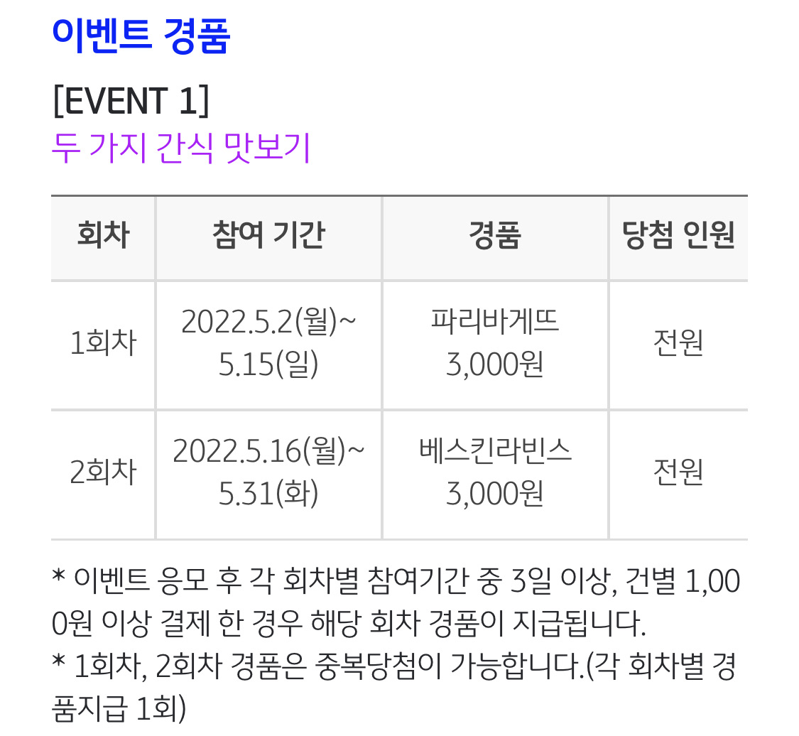 1회차 : 5월 15일 일요일까지 - 파리바게뜨 3,000원