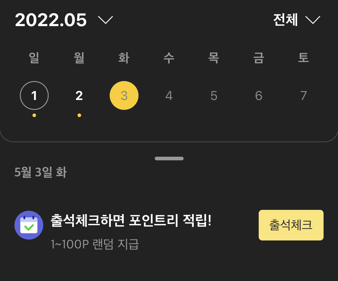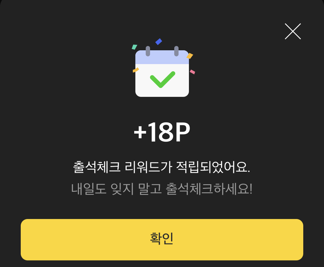 출석체크 노랑 버튼 누르면 포인트 지급받을 수 있어요.