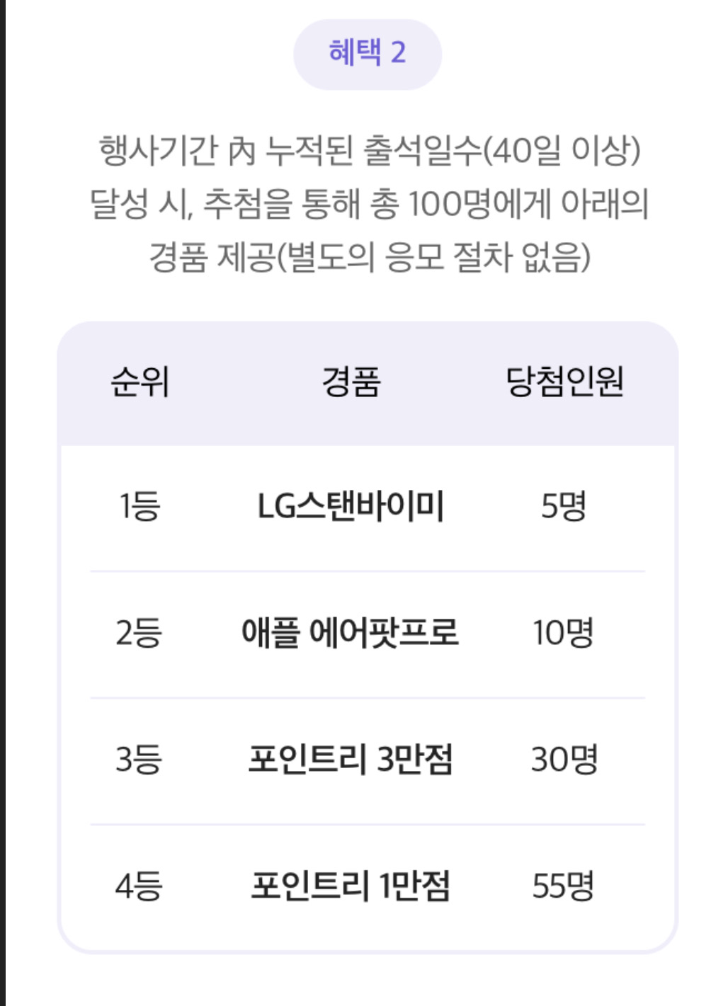 누적된 출석일수 40일 이상 달성하면 추첨을 통해 100명에게 경품도 제공한데요.
