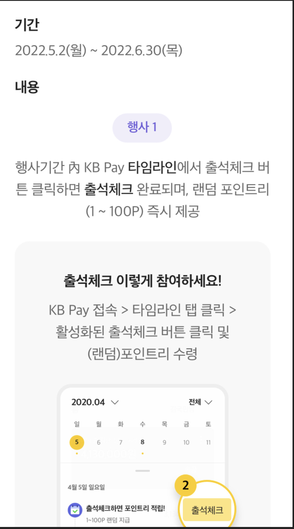 KB PAY 접속 > 타임라인 탭 클릭 > 활성화된 출석체크 버튼 클릭 및 (랜덤) 포인트리 수령