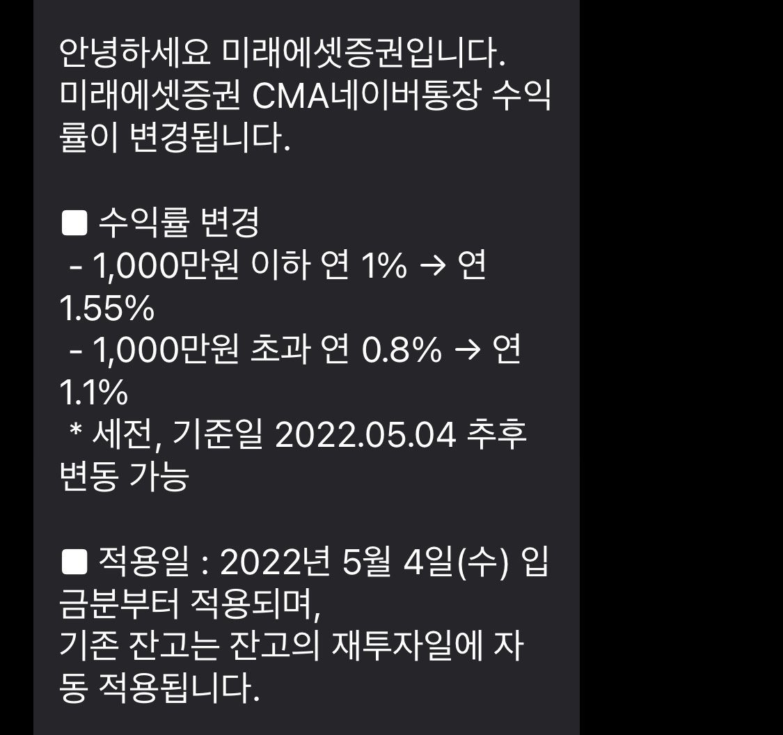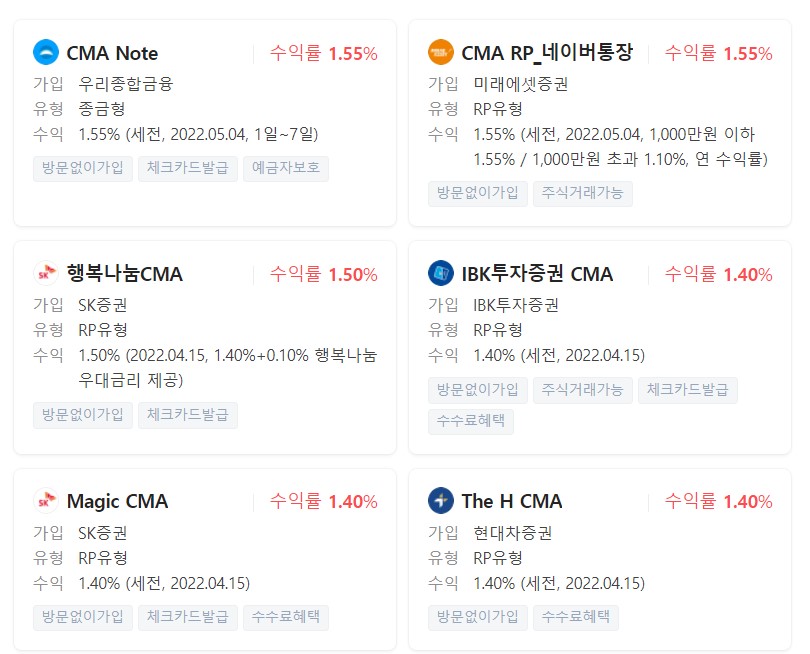 ✔ CMA RP_네이버통장 / 미래에셋증권 / RP / 1,000만 원 이하 1.55% / 1,000만 원 초과 1.1%